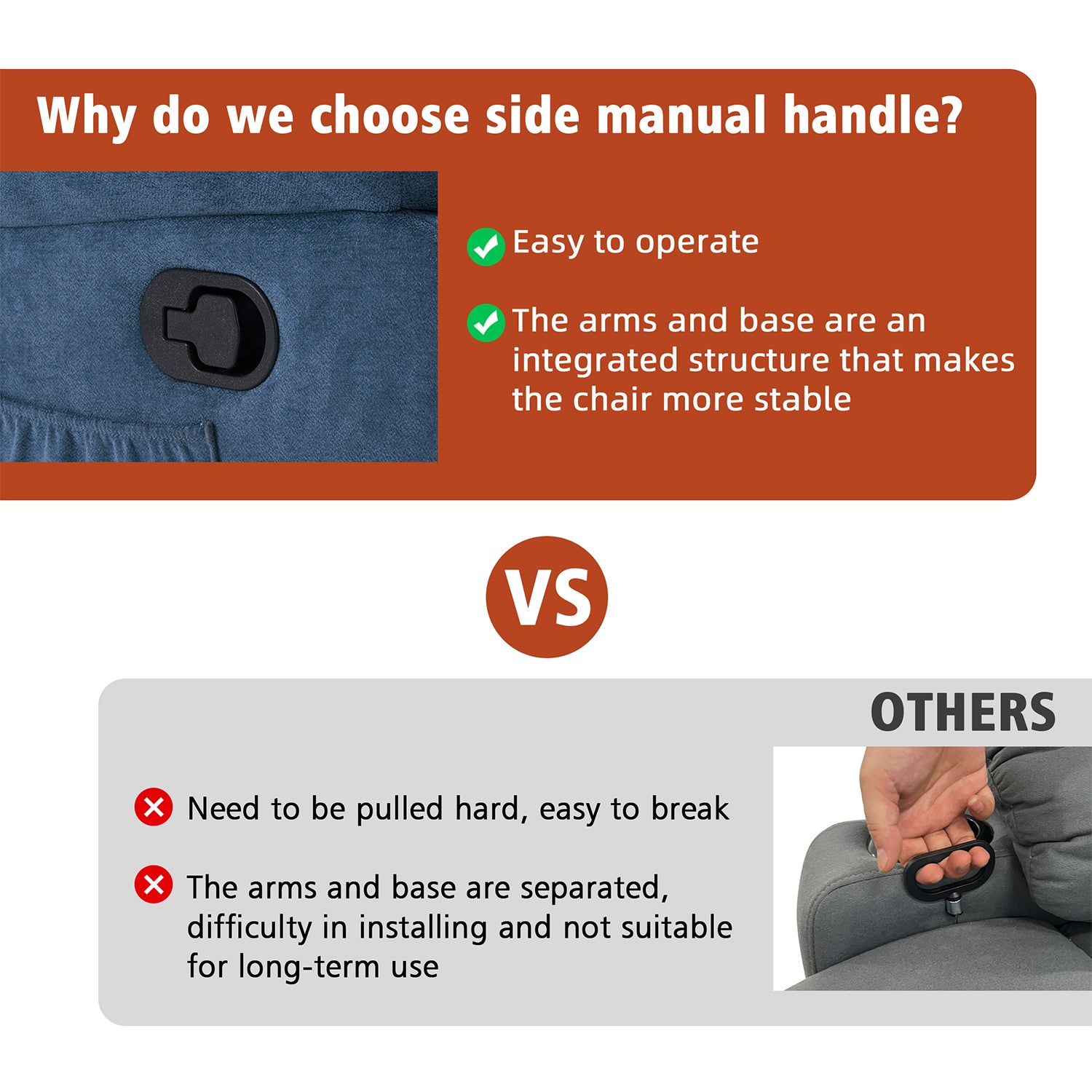- Manual Recliner Chair:This recliner chair features a manual reclining mechanism. Only pulls out the lever on the arm of the recliner, the footrest will pop out automatically. Keep your elbows on the armrest, and when you lean back with some force, the manual recliner will tilt freely to your preferred position for personalized comfort. Allowing you to find the perfect angle for reading, watching TV, or napping.