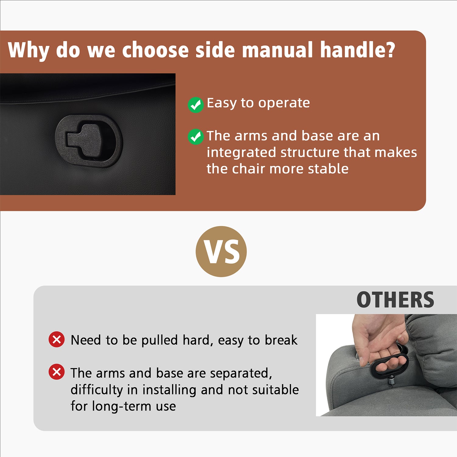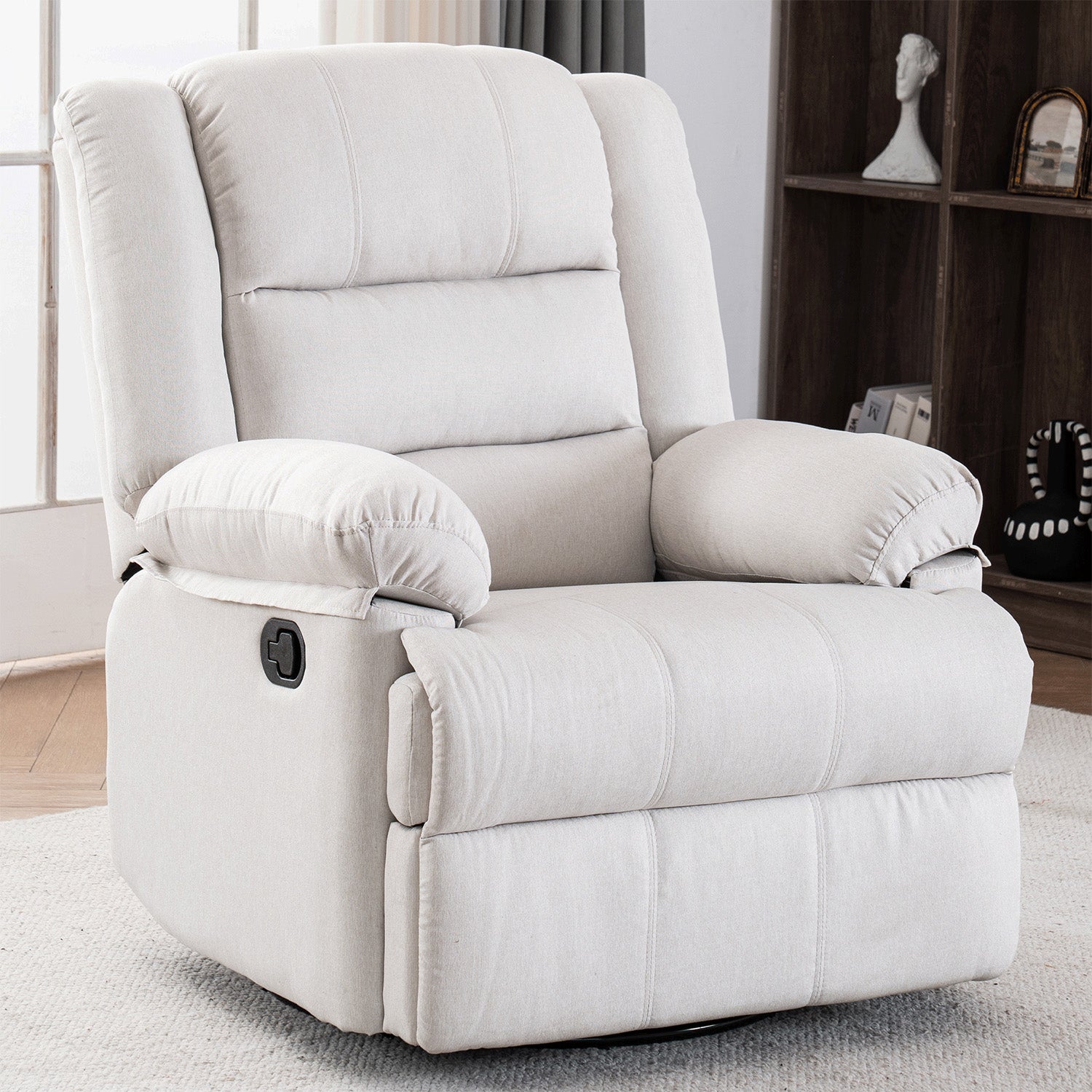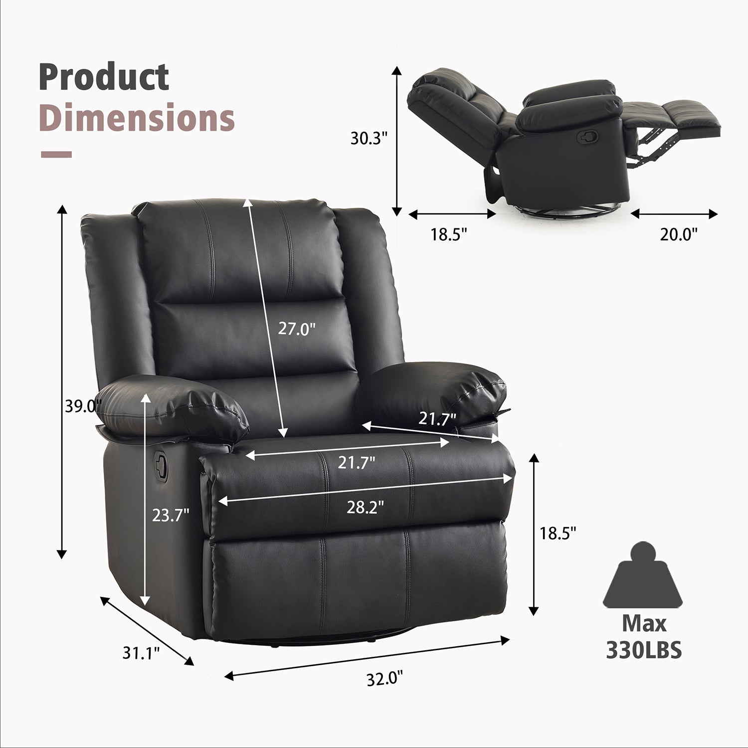 - 【Manual Recliner Chair】The recliner features 360°swiveling, 30°rocking and 90°-160 °degrees of free recline. This recliner chair features a manual reclining mechanism. Only pulls out the lever on the arm of the recliner, the footrest will pop out automatically. Keep your elbows on the armrest, and when you lean back with some force, the manual recliner will tilt freely to your preferred position for personalized comfort. Allowing you to find the perfect angle for reading, watching TV, or napping.